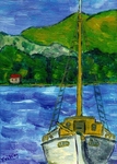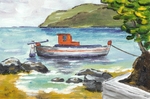 2007Vissersbootje in een baai van het Griekse Cyckladeneiland Fourni; acryl op papier, niet ingelijst
